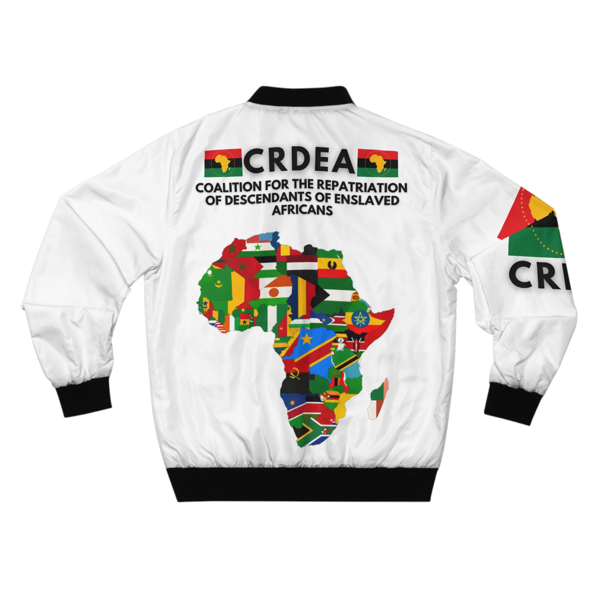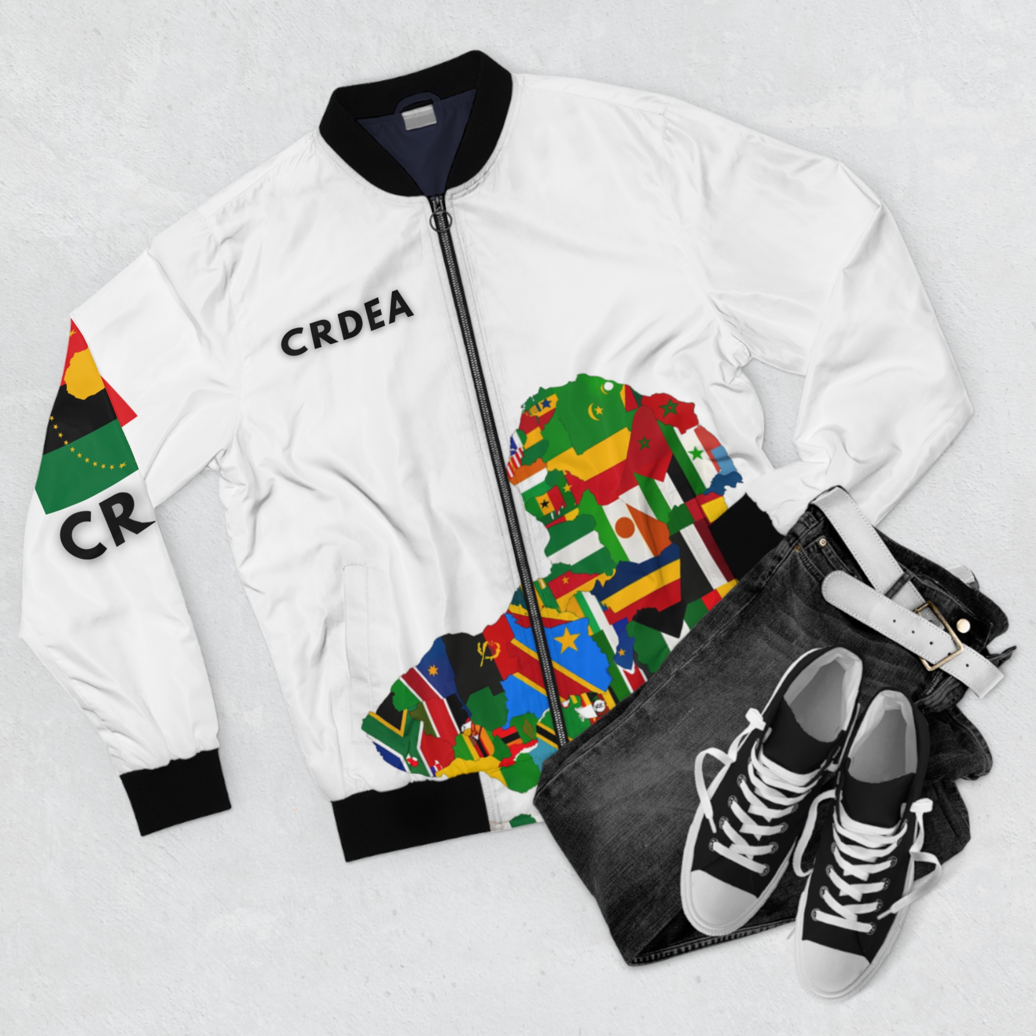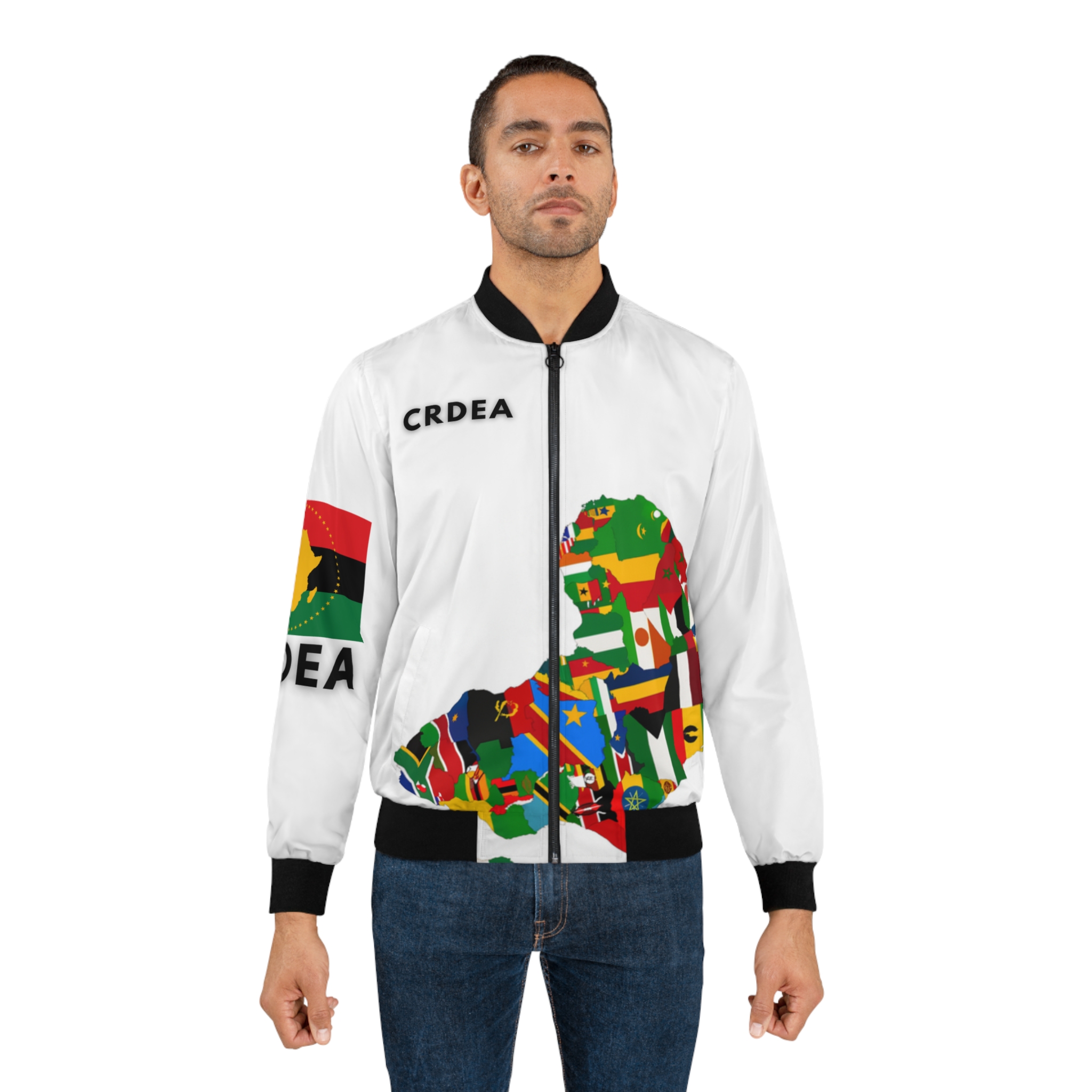 This lightweight bomber brings bold, meaningful style to everyday wear. A vibrant map of Africa—filled with the flags of African nations—wraps across the front and back, announcing connection and heritage without saying a word. The clean white field and black ribbed cuffs, collar, and hem make the colors pop. Wear it on community outings, cultural events, or when you want to carry a visual statement about roots and solidarity. The metal zipper and structured fit give it street-ready form while the full-coverage print keeps the artwork front and center.