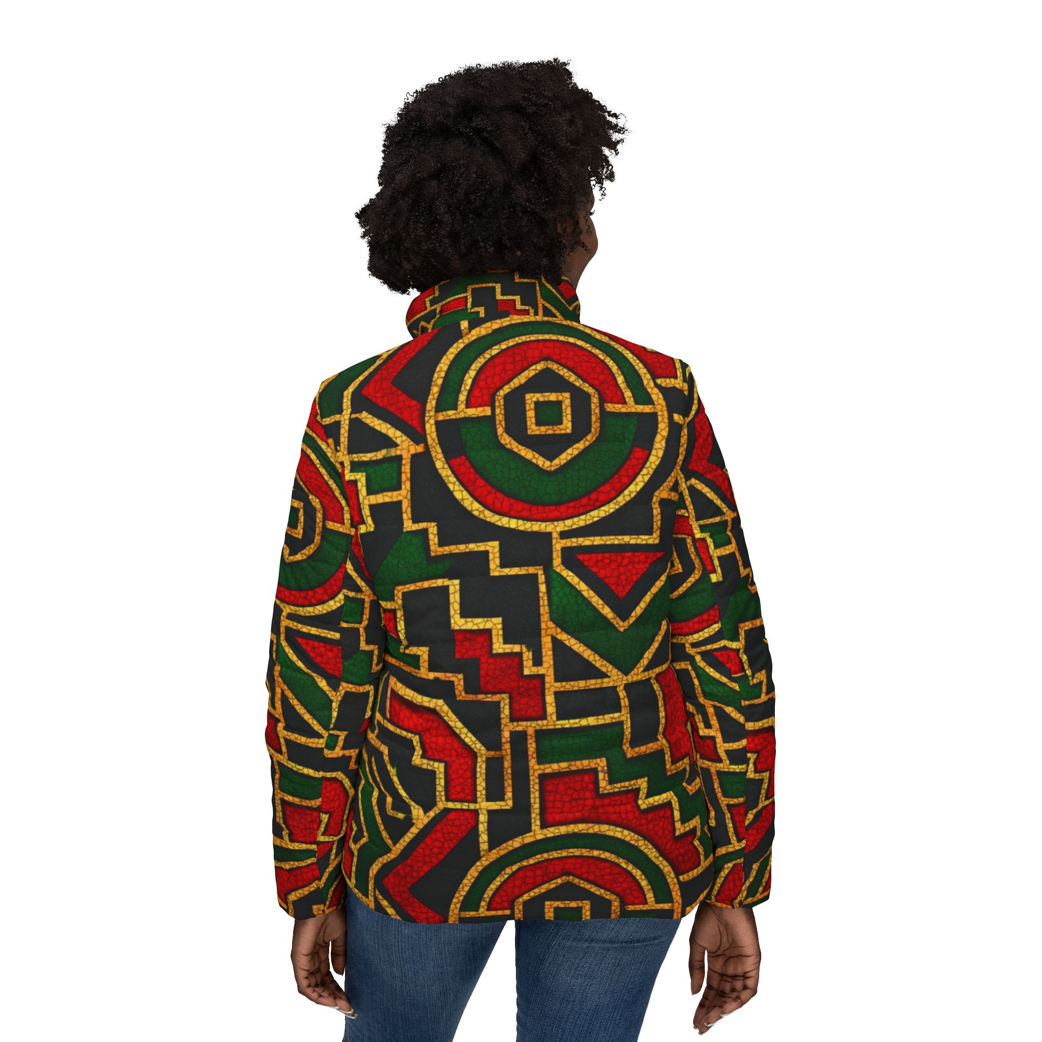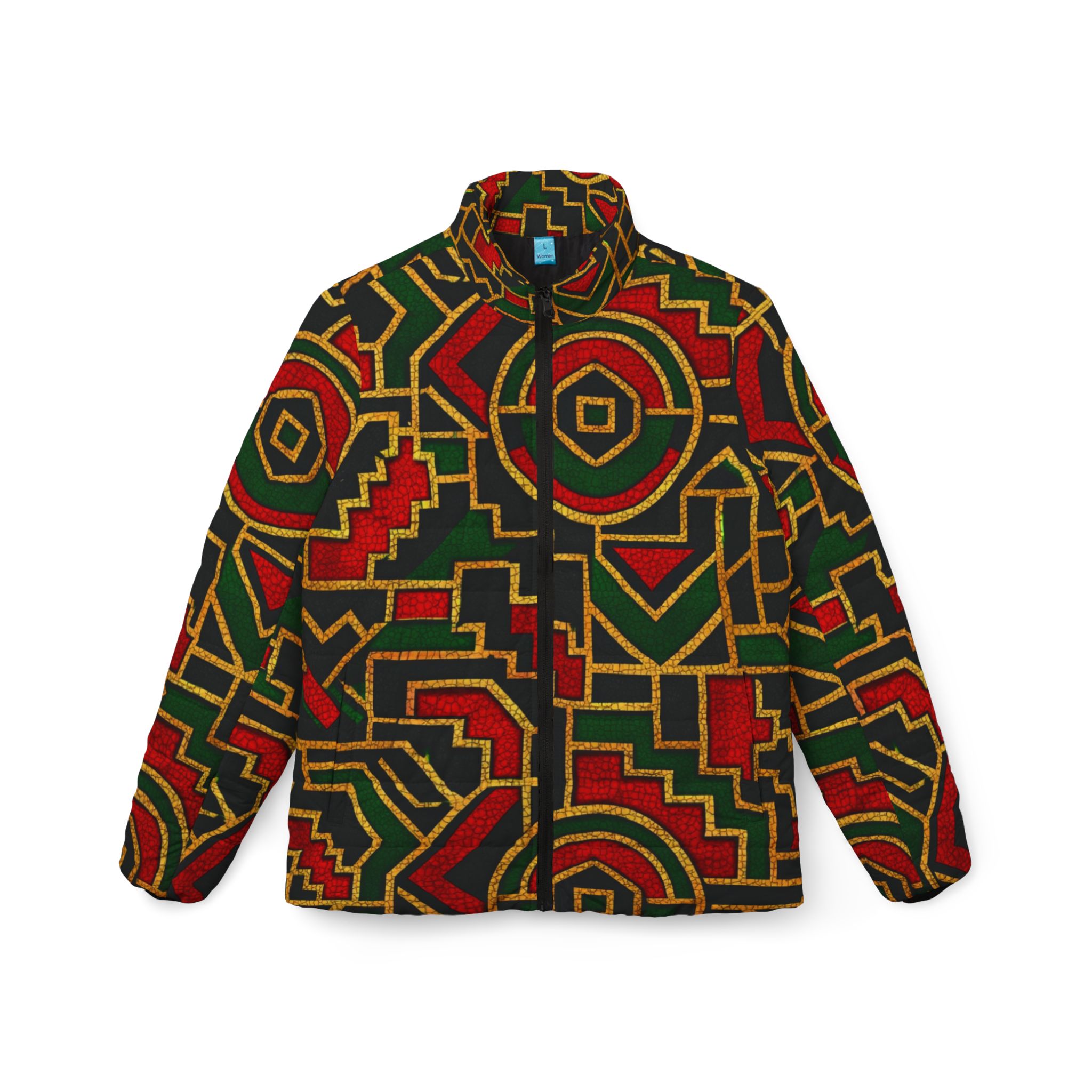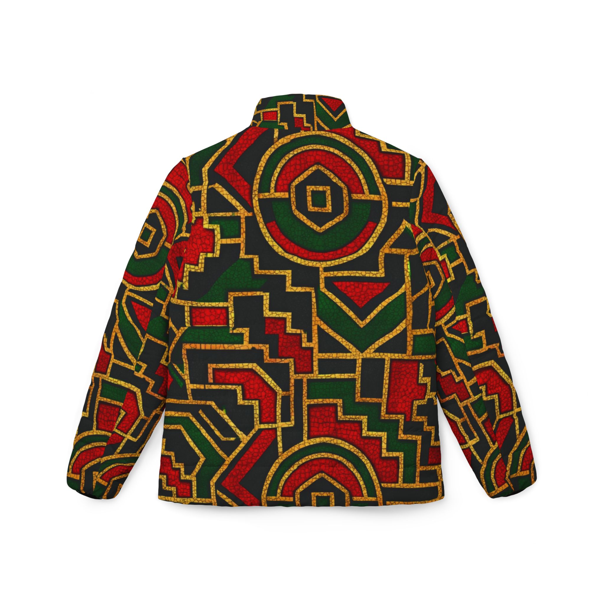 This padded jacket brings bold, geometric energy to everyday warmth. The all-over print mixes deep forest green, warm red and golden accents into a retro-architectural pattern that reads both modern and rooted. Lightly insulated with a soft cotton-like polyester lining, the jacket feels cozy without weighing you down. A full front zipper and slanted, self-lined pockets keep hands warm and essentials close. Wear it on chilly city walks, weekend markets, or layered over knitwear for an artsy, confident look that stands out in any crowd.
